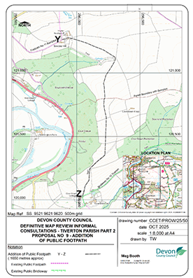 Here are the details regarding the proposal for the addition of a public footpath from Bowbier Hill in Bampton Parish to Cove Down. Anyone who has any evidence for or against or wishes to make any comments relevant to the proposals made or has any other proposals to make concerning alterations or additions to the Definitive Map for Tiverton parish, is asked to send their evidence/comments by the 31st January 2026.  Click to view the Schedule of Proposals and the Consultation notice.  You can see the map in larger detail here.